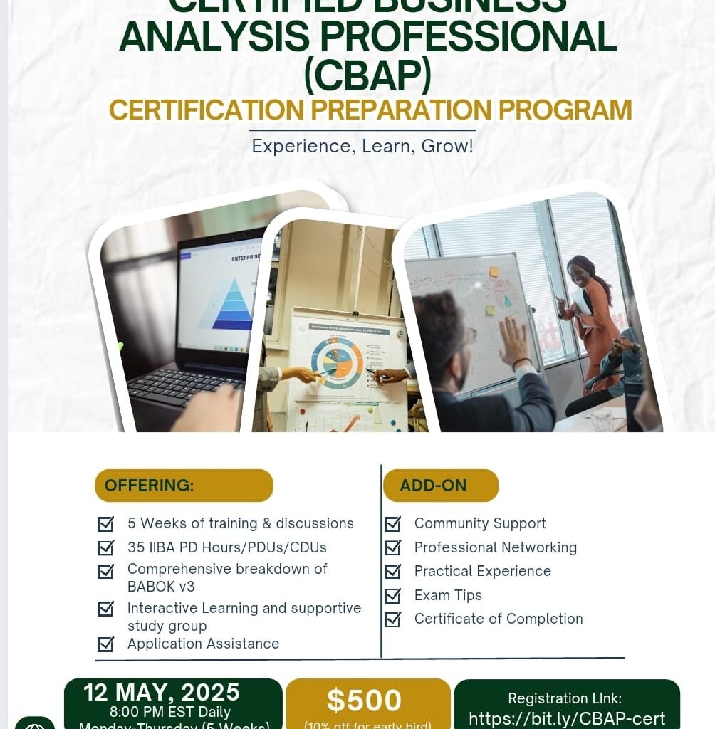 If you’ve been thinking about taking that next big step in your BA journey — not just breaking in, but getting certified and standing out — this 5-week intensive course is for you! This program is designed for aspiring BAs who are serious about earning their certification and building the skills to back it up. Whether you’re already working in a BA role or looking to solidify your experience with a globally recognized credential, this course will get you ready. 🗓 Course starts May 12th | Monday to Thursday sessions Here’s what to expect: ✅ Targeted certification prep✅ Practical guidance✅ Supportive learning environment✅ Structured learning over 5 weeks✅ Real-world insights to boost your confidence 📌We’ve got an information session coming soon — and it might come with a surprise for attendees😉. Stay tuned for the official date! Don’t keep this to yourself — share with someone who’s ready to get certified and elevate their career. To register, simply click here Let’s go!💼✨