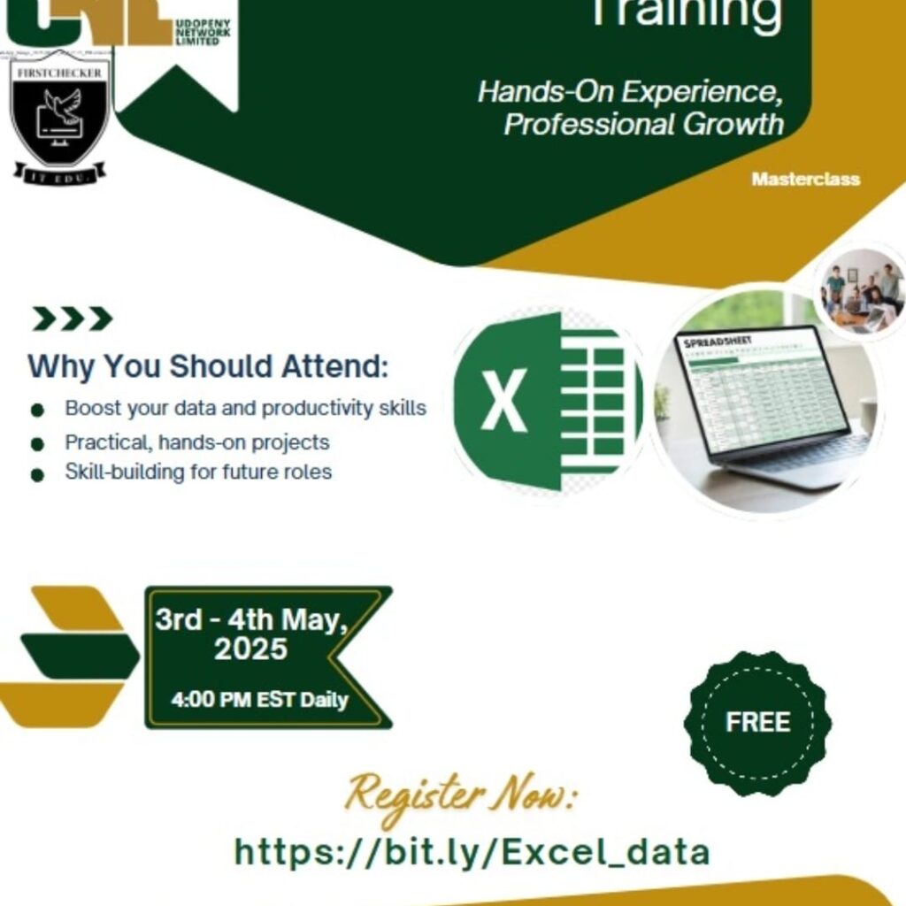 Join us for an exciting Excel Training Masterclass — a hands-on experience designed to supercharge your data, productivity, and career growth! Dates: 3rd – 4th May, 2025Time: 4:00 PM EST DailyCost: FREE! Why You Should Attend: Boost your data and productivity skills Work on practical, hands-on projects Build skills for future career opportunities Register now: https://bit.ly/Excel_data Don’t miss this opportunity to level up!